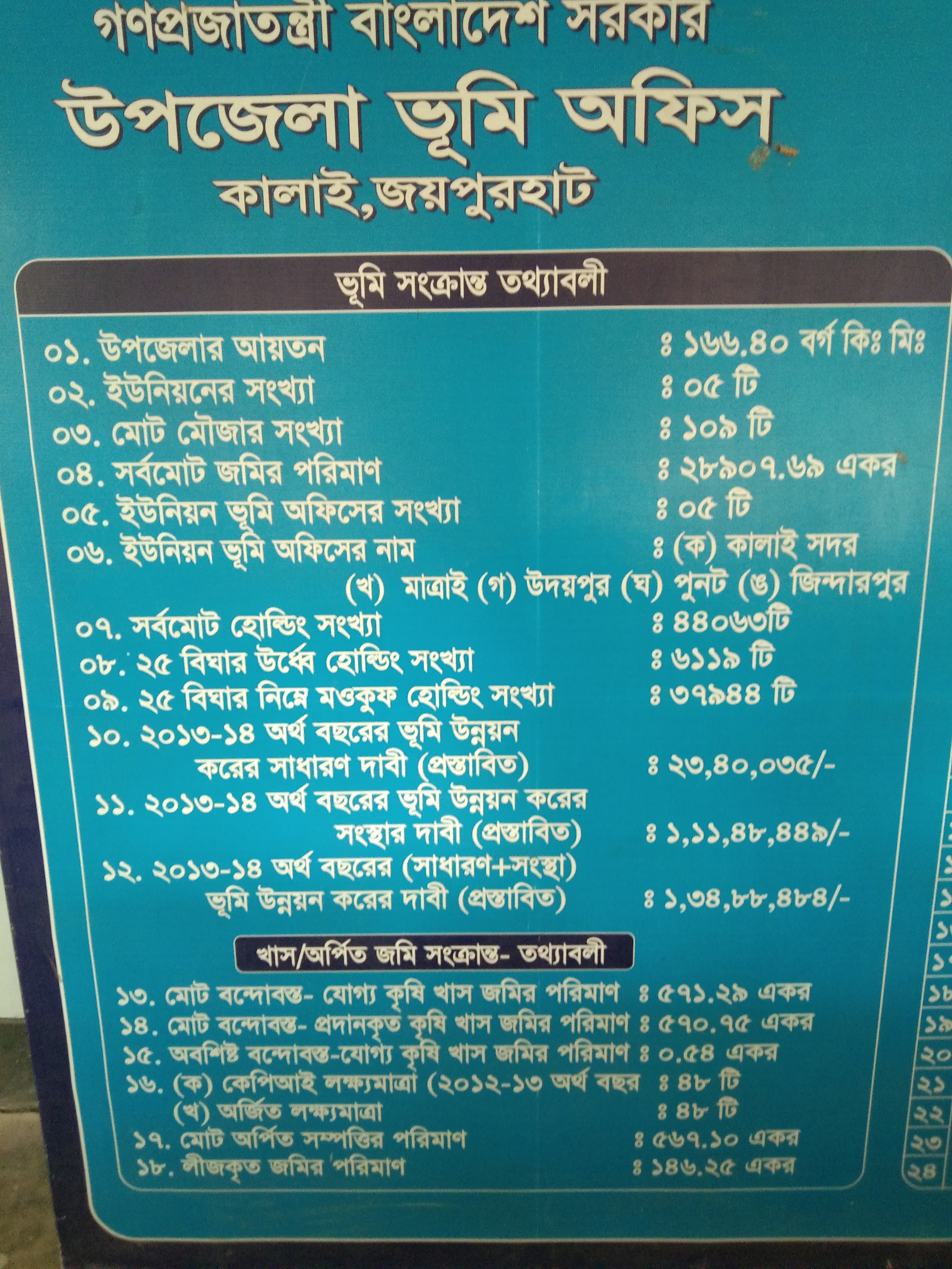 | জয়পুরহাট জেলার কালাই উপজেলার কালাই মৌজার ০১ নং খাস খতিয়ান ভুক্ত ৩১০ ও ৩১১ দাগে মোট ০৯ শতক জমির উপর ০৫ কক্ষ বিশিষ্ট একতলা নিজস্ব ভবনে উপজেলা ভূমি অফিসের কাজকম চলছে। □ মোট ইউনিয়ন ভূমি অফিসের সংখ্যা-০৫ টি □ মোট মৌজা সংখ্যা-১০৯ টি □ মোট হোল্ডিং সংখ্যা- ৫৮১১০ টি □ ২৫ বিঘার উপরে হোল্ডিং সংখ্যা- ৫৮৯৮ টি □ ২৫ বিঘার নিচের হোল্ডিং সংখ্যা-৪৮২০৩ টি □ বাণিজ্যিক হোল্ডিং সংখ্যা- ৪৬৫ টি □ আবাসিক হোল্ডিং সংখ্যা- ৩৩৮৩ টি □ সংস্থার হোল্ডিং সংখ্যা- ১৫৪ টি □ মোট জমির পরিমাণ- ৩৯৬৫৭.৬২ একর □ মোট খাস জমির পরিমাণ- ১৪৮০.১১ একর □ মোট কৃষি খাস জমির পরিমাণ-৫৭১.২৯ একর □ বন্দোবস্তযোগ্য খাস জমির পরিমাণ-৫৭১.২৯ একর □ হাট-বাজারের সংখ্যা- ১৩ টি □ দিঘী-০১ টি □ ২০ একরের নিচে জলমহালের সংখ্যা-৪১৮ টি □ ভিপি পুকুরের সংখ্যা- ১১৯ টি □ গুচ্ছগ্রাম/আদশগ্রামের সংখ্যা-০৭ টি □আশ্রয়ন প্রকল্প-০৫ টি □আশ্রয়ন প্রকল্প (ফেইজ-২) এর সংখ্যা-১২ টি |